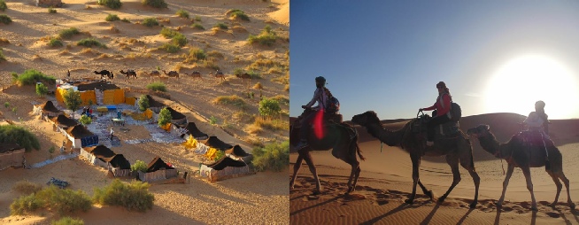 Morocco Berber Travel organizes tour from Marrakech with experienced drivers and guides to explore Sahara desert. We will pick you up from Fez riad/Hotel at 07 h 30 by your Guide Or driver to Merzouga Erg Chebbi 8 hours journeys takes you across the Middle Atlas Ifrane where the ski resort located,then we will have a stop in ceder forest Azrou,where are the monkeys Barbary apes,you can get bananas to feed them in a distance,and we stop for lunch in Midelt,we will continue along the way via Ziz valley with its beautiful and impressive panoramic views over the palm trees,it is the largest oasis of Tafilat with many Saharian villages and towns in the way,then we continue deeper to amusing Moroccan Sahara desert,till yellow send dunes appear,it is one of the best desert in the north of Africa. Wen you arrive the hotel you will have cup of tea,then you ride camel to the middle of Sahara desert and sleep in a Berber tent.