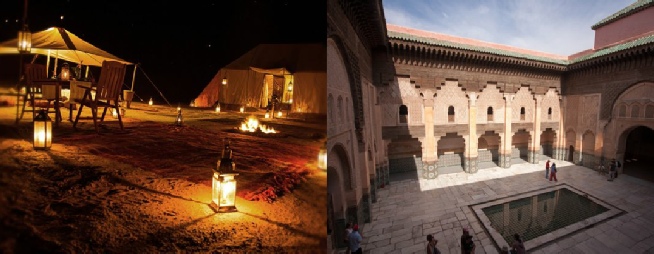 You will be with a local guide who will escort you around this beautiful city, visiting historical monuments: the gorgeous Bahia palace built in 19th century, the 17th century Saadian tombs, the Koranic School of Ben Youssef, and the Koutoubia mosque built in 12th century. You will also visit the famous Souks; a great place for shopping where you can buy presents for your family, friends or yourselves. You will have free time to enjoy a mint tea or coffee in one of the restaurants or cafes where you can get amazing panoramic views of Jemaa el-Fnaa square.