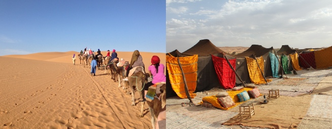 Today in the morning we continue our 3 day desert tour from Fez to Merzouga and we explore the dunes of Erg Chebbi. We will visit a Berber family , and listen to Gnawa music in village of Khamlia. Then we will visit some deserted mines, Berber nomads and oasis of palm trees. For lunch we will head back to Merzouga and then we ride camels to the desert. We will spend the night in desert camp with drums music in the middle of the Sahara. We climb the high dune to watch the sunset over the dunes and we spend the night in desert nomad tents in the middle of the sand dunes.